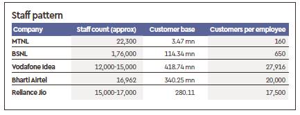 State-run telecom firm BSNL, which missed timely payment of salaries in February, serves only around 650 customers per employee, a sharp contrast from private players where per employee customers are in the range of 17,500 to 27,500. The situation at MTNL is even worse where per employee customers are a meagre 160.