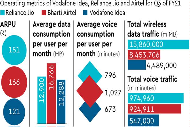 For instance, Vodafone’s Q3FY21 revenues at Rs 10,894 crore were up only 1% q-o-q, compared with increases of 7% and 6% for Bhartiand Jio, respectively. Its Arpu in the December 2020quarter was Rs 121 compared with Rs 166 for Bharti and Jio’s Rs 151. Vodafone’s net subscriber loss during the quarter narrowed q-o-q from 8 million to 2 million, while Bharti’s net addition stood at 14 million and Jio’s at 5 million.