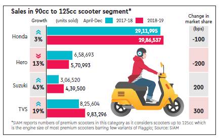 Premium scooters are more powerful, cost 10-20% higher than mass-market scooters and also have 10-20% lower fuel economy. Boosted by gains made in the premium segment, overall scooter sales of Suzuki Motorcycle and TVS Motor expanded by 43% and 19% y-o-y, respectively, in the April-December 2018 period, whereas market leader Honda Motorcycle and Scooter India grew a tepid 3%.