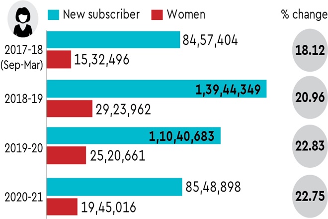 As per EPFO’s the latest payroll data, of the 85 lakh new subscribers’ addition in the 2020-21 fiscal, 19 lakh comprised women. In 2019-20, of the 110 lakh new additions to the EPFO’s subscribers’ base, 25 lakh were women.