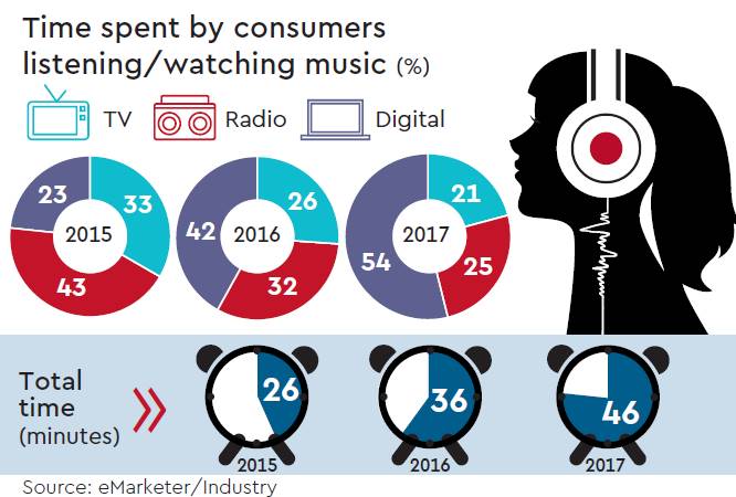 However, media planners point out that in terms of revenue both music channels and music streaming apps continue to struggle. “Both the platforms are struggling but TV is slightly better placed since the ad inventory of music channels are bundled with movie channels,” explained a senior media planner. Also, as music apps continue to struggle to generate subscription revenue, the focus has shifted to generating enough usage, so that these platforms are able to charge a sustainable ad rate, said a senior media planner. While the cost of creating original content — radio jockey and video jockey lead talk shows, podcasts and music videos—is more or less similar at `80,000 to `1 lakh, TV commands the highest advertising rates. Also, music rights must be paid for separately. And again, music channels pay the most to acquire songs since they need video content, compared to private FM broadcasters or a music app, which buy audio rights. The cost of a ten-second ad spot on a music channel such as Mastii and 9XM is close to Rs 1,000, while music apps such as Saavn and Gaana charge anywhere between `150-250 cost per thousand impresssions (CMP) for a ten second ad spot. A ten-second spot during prime time— between 7 am to 11 am and again 6 pm to 8 pm — ranges between `500-800 depending on the number of stations a private FM player operates.