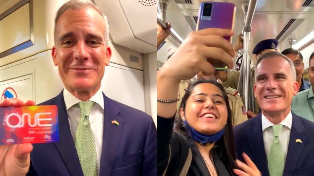 The video opened with Garcetti holding a Delhi Metro card, saying ‘Delhi Metro, Mera Metro’. This was followed by Garcetti recharging the metro card and using it at the entrance. He then boarded a train packed with passengers amid heavy security.