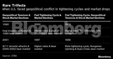 It’s rare for the Fed to raise rates at a time when markets are under pressure and geopolitical tensions are bubbling. In fact, the last two times the S&P 500 entered a correction or bear market while the Fed was in a tightening cycle occurred during the Hungarian uprising and Suez Canal crisis of 1956 and the Tet Offensive in 1968, a pivotal moment in the Vietnam War in which the North launched a coordinated attack on the South and inflicted severe casualties.
