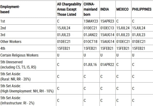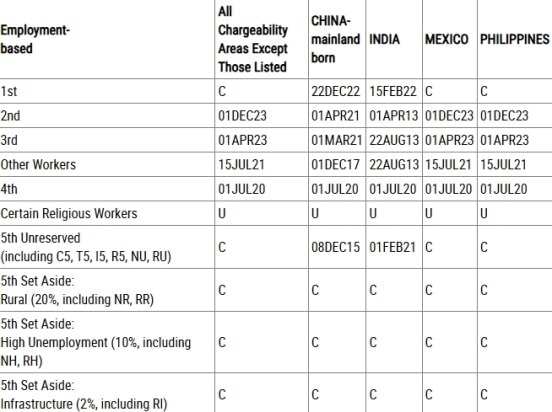 The “C” listing indicates that the category is current, and that applications may be filed regardless of the applicant’s priority date. The listing of a date for any category indicates that only applicants with a priority date that is earlier than the listed date may file their application.