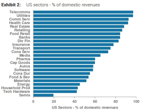 Otherwise, some of the US sectors with the highest domestic exposure – including Utilities, Telecoms and Commercial Services are relatively small from a market cap perspective (all three account for just 5% of the market).