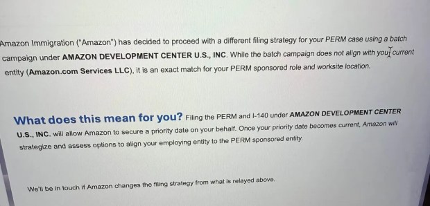 “Amazon Immigration (“Amazon”) has decided to proceed with a different filing strategy for your PERM case using a batch campaign under AMAZON DEVELOPMENT CENTER U.S., INC. While the batch campaign does not align with your current entity (Amazon.com Services LLC), it is an exact match for your PERM sponsored role and worksite location.
