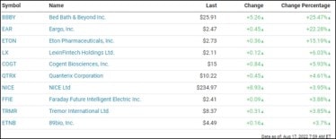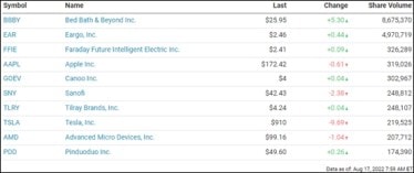 Some of the most active stocks by share volume are Bed Bath & Beyond Inc.(BBBY), Eargo, Inc.(EAR), Faraday Future Intelligent Electric Inc.(FFIE), and Apple Inc. (AAPL). Bed Bath & Beyond Inc.(BBBY), Eargo, Inc.(EAR), and Eton Pharmaceuticals, Inc. (ETON) were showing the biggest gains.