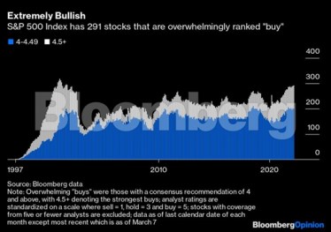 Bloomberg Opinion: U.S. stocks slumped the most in 17 months on Monday, but the “buy the dip” mentality isn’t dead in the U.S. — and stock analysts are part of the reason it’s likely to stick around awhile. Research on individual stocks is as bullish as it has been in two decades by some measures.