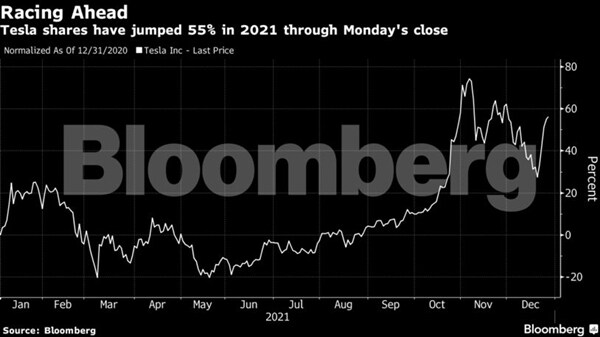 Tesla shares have had a stellar year, with a 55% gain through Monday’s close that propelled the company’s market value above $1 trillion. Chief Executive Officer Elon Musk has been offloading stock since November, and said on Twitter last week that he is “almost done” with a target of reducing his stake by 10%.