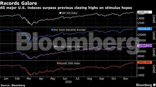All major indexes for U.S. equities — the S&P 500, the Dow Jones Industrial Average, the Russell 2000 and the Nasdaq Composite Index — closed at records. Such synchronized highs were last seen in January 2018. The dollar posted its biggest weekly decline in five, while the yield on the 10-year Treasury note reached the highest in nine months.