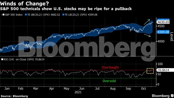 After the recent rally in equities, technical indicators are signaling heightened volatility. Not only is the S&P 500 pushing the limits of its trading envelope — built around moving price averages — but the widening of its upper and lower bands can also be a precursor to greater swings. Furthermore, the gauge’s 14-day relative strength index is above 70, which is seen by some traders as a threshold for being considered overbought.