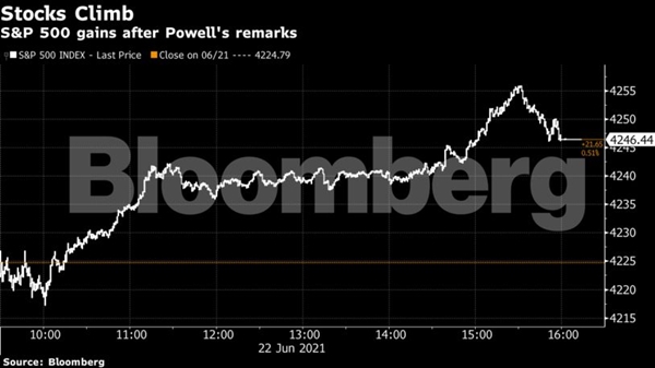 Bloomberg: Stocks climbed after Federal Reserve Chair Jerome Powell reiterated his views that inflation pressures will be transitory even after a notable increase in recent months. The dollar fell.