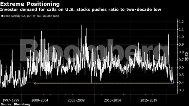 A key sentiment indicator for U.S. stocks has reached its most bullish level in two decades. The weekly Cboe ratio of volume traded in puts versus calls fell to the lowest since July 2000 last week. This implies extreme positioning to the upside, as investors look beyond short-term uncertainty toward a continuing global recovery in 2021.