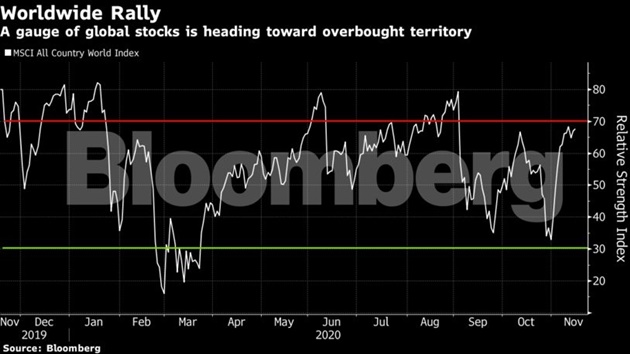 A gauge of global stocks headed toward a record Monday amid optimism that the expected roll-out of vaccines and additional U.S. fiscal stimulus will bolster the world economy. Still, skeptics argue the short-term outlook is challenging as nations resort to lockdowns to fight a resurgence in virus cases and lawmakers bicker over the size of U.S. relief spending.