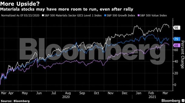 “Our positive view of materials stocks depends on whether the global economic recovery gathers pace,” Talley Leger, senior investment strategist at Invesco, said. “Should the economy suffer a relapse, it would likely be difficult for materials stocks to continue outperforming.”