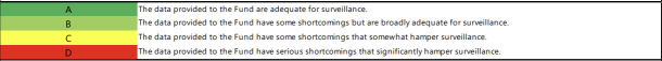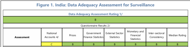 Within the IMF’s Article IV Consultations, the Staff assigns grades ranging from A-D across multiple categories – National Accounts (GDP Data) , Prices (CPI, WPI, PPI etc.), Government Finance Statistics (Revenue, Expenditure, Public Debt etc.), External Sector Statistics (Balance of Payments, FDI Inflow/Outflow etc.), Monetary and Financial Statistics (Money Supply, Interest Rates etc.), Inter-sectoral Consistency (Consistency across categories).