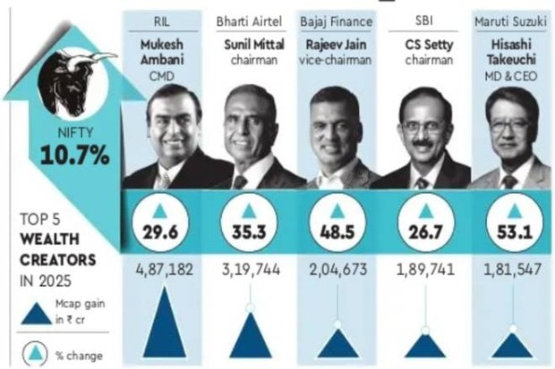 It was not alone. Bharti Airtel, Bajaj Finance, SBI and Maruti Suzuki rounded out the top five wealth creators, each adding more than Rs 1.5 lakh crore to their m-cap during the year.