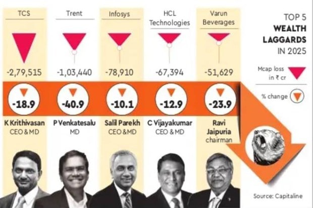 HDFC Bank followed close behind, underscoring the dominance of financial heavyweights in 2025. The year, however, was far from kind to everyone. Trent, TCS, Infosys, HCL Tech and Varun Beverages figured among the biggest laggards.