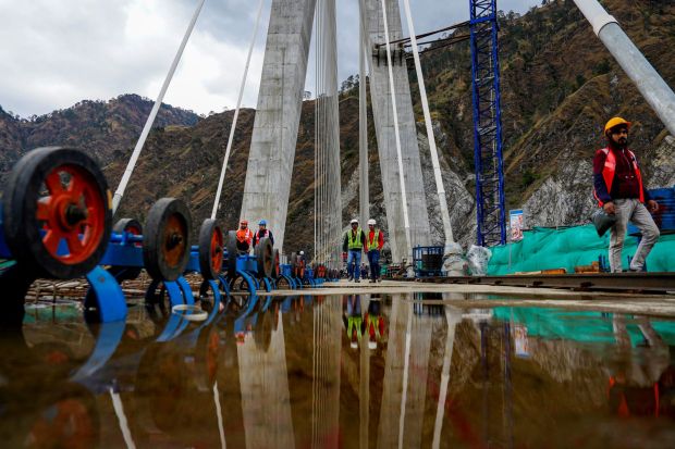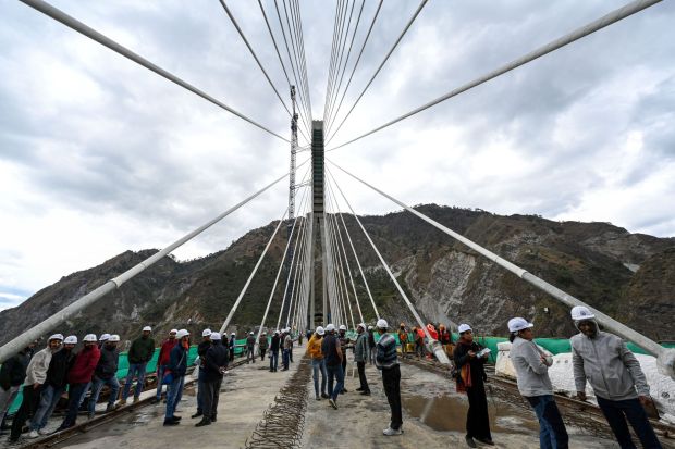The asymmetrical cable-stayed bridge balanced on the axis of a central pylon, connects tunnels T2 and T3 on the Katra-Banihal Section of the Udhampur-Srinagar-Baramulla Rail Link project.