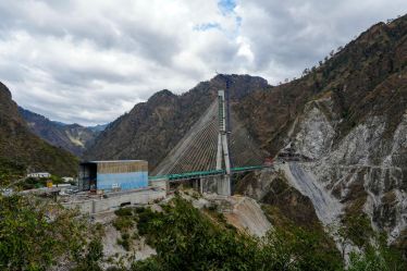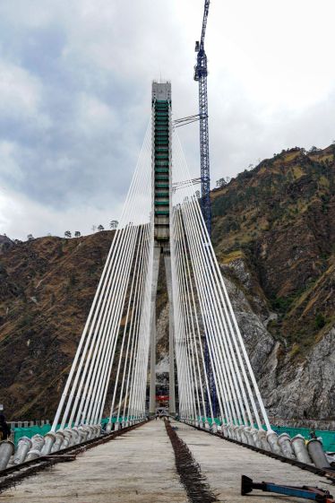The asymmetrical cable-stayed bridge balanced on the axis of a central pylon, connects tunnels T2 and T3 on the Katra-Banihal Section of the Udhampur-Srinagar-Baramulla Rail Link project.