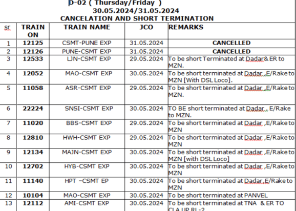 The Central Railway’s Mumbai division has posted the list of cancelled and short-terminated train details on their social media handle. The post reads, “Special Block Alert! Special midnight block up to 01/02.06.2024 for Pre Non-Interlocking works. Block repercussions today on 30/31.05.2024. Suburban/Mail Exp train services will not be available between Byculla and CSMT from 00.30 hrs to 04.30 hrs (midnight of 30/31.05.2024).”