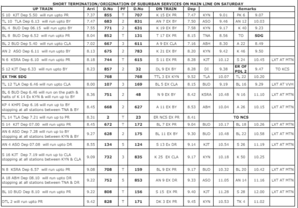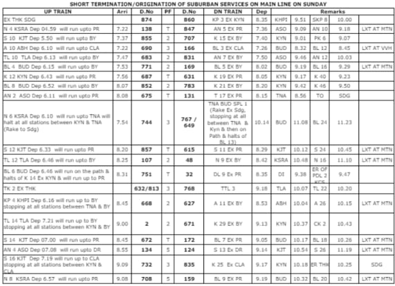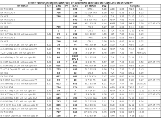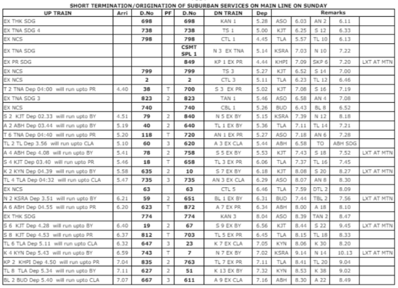 The mega block will be implemented for platform extension and widening works at Chhatrapati Shivaji Maharaj Terminus (CSMT) in south Mumbai and Thane station. Several mail-express and suburban trains will be short-terminated and short-originated from Wadala, Dadar, Thane, Pune, Panvel, and Nashik stations. The Railways have requested the Brihanmumbai Electric Supply and Transport (BEST) and the Maharashtra State Road Transport Corporation (MSRTC) to operate additional buses for passenger convenience.