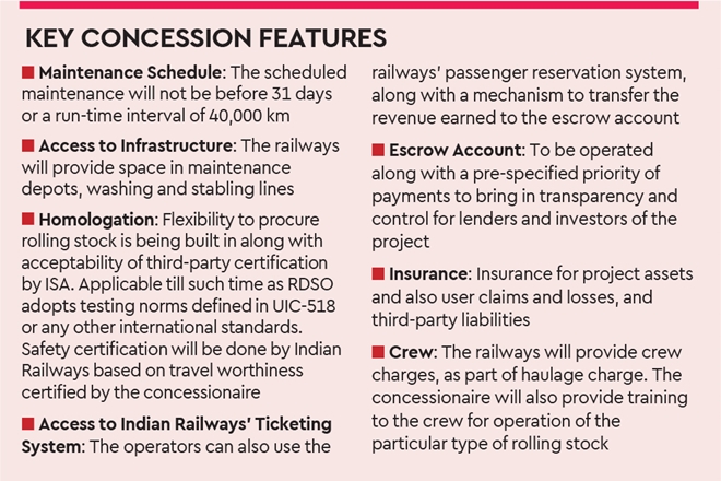 Safety certification of the rakes will be in line with all the railways’ safety and security parameters. The concession period will be for 35 years, and the PPP operator may procure trains and locomotives as per choice as long as they are compatible with predetermined specifications and standards. With regard to introducing new rolling stock, the validation will be done by an accredited independent safety assessor on an Indian Railways track, until such time RDSO adopts testing norms as set out in UIC-518 or other international norms.
