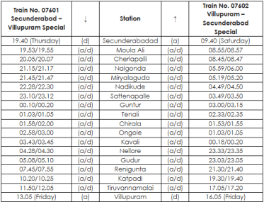 To accommodate the increased demand for travel, South Central Railway has introduced special train services between Secunderabad and Villupuram. Train No. 07601 will depart from Secunderabad at 7:40 PM on Thursday, December 12, 2024, and arrive in Villupuram at 1:05 PM the following day. On its return journey, Train No. 07602 will leave Villupuram at 4:05 PM on Friday, December 13, 2024, and reach Secunderabad at 9:40 AM the next day. Both services are scheduled as one-time specials.