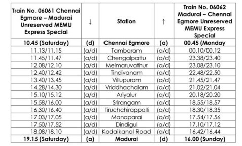 Southern Railway has announced the operation of special one-way MEMU Express trains between Madurai and Chennai Egmoreto accommodate the increased passenger demand during pongal festival . These trains will provide convenient travel for passengers looking to visit family and friends during the festive season.