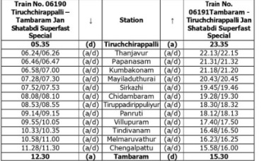 Train No. 06190, the Tiruchchirappalli to Tambaram Jan Shatabdi Superfast Special, will depart from Tiruchchirappalli at 5:35 am and arrive in Tambaram at 12:30 pm on January 4, 5, 10, 11, 12, 13, 17, 18, and 19. In the return direction, Train No. 06191, the Tambaram to Tiruchchirappalli Jan Shatabdi Superfast Special, will leave Tambaram at 3:30 pm and reach Tiruchchirappalli at 11:35 pm on the same dates.