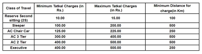 Tatkal ticket charges vary depending on the type of coach you choose – second sitting, sleeper, AC Chair car, Ac 3 tier, AC 2 tier and executive. The minimum Tatkal charges are Rs 10 for 100 km and can go up to a maximum of Rs 500 for a distance of 500 km or depending on the class of coach. The full details are given in the image below: