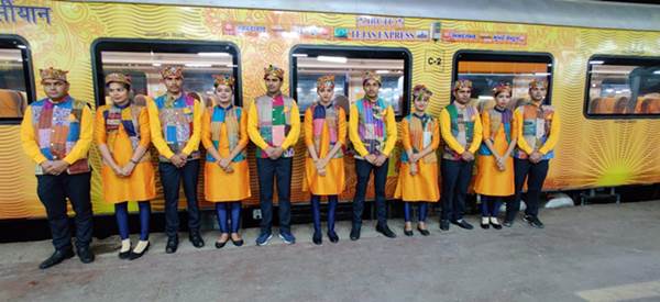 IRCTC has stated that high quality food and beverages will be provided to the passengers on board in the train. This is included in the train fare. Service in the train will be done through trolleys which is a common practice on flights. Passengers will get RO water filter, packaged drinking water bottle. There will be tea, breakfast and combo lunch/snacks, evening high tea and dinner. Complimentary tea or coffee service is available to passengers at any point of the journey.