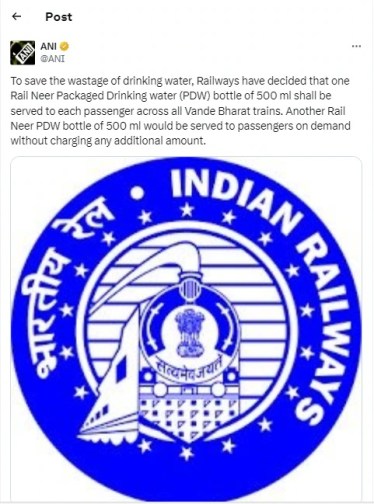 The Indian Railways has announced that all passengers of Vande Bharat trains will now be given a 500 ml bottle of Rail Neer Packaged Drinking Water (PDW) during their travel.
