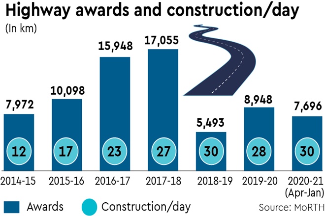 Despite the pandemic, highway construction in April-January this fiscal rose to 30 km/day, from 28 km/day in 2019-20. In the past, it was only in 2018-19 that the pace of building of highways touched the 30 km/day mark. February-March period of the current fiscal is seen witnessing even speedier construction.