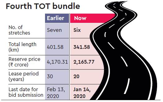 Following the removal of the PNG stretch, the reserve price for the remaining six stretches, measuring 341.58 km, under the fourth TOT bundle has now come down to Rs 2,166 crore from Rs 4,170.31 crore originally set for all seven stretches. PNG accounted for 35% of the total collection from all stretches put up for bidding under the fourth TOT bundle. The last date for the submission of bids has been fixed at January 14.