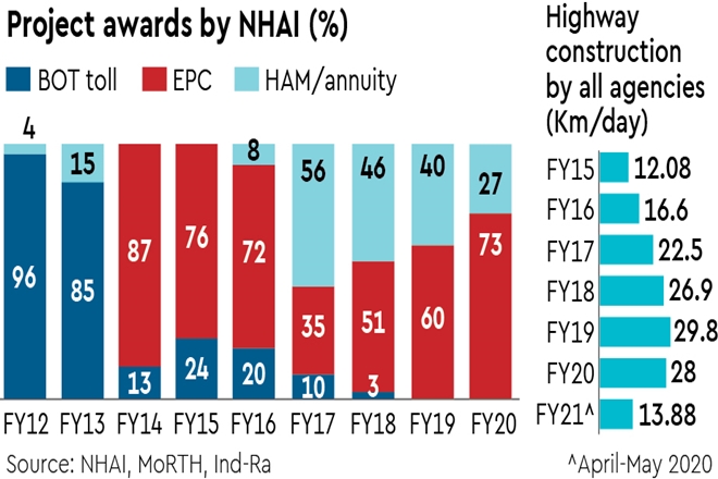 From a high of 96% of its all project awards in 2011-12, NHAI’s project awards through the BOT (toll) route came to a naught in the last two fiscals. However, it attempted two projects in West Bengal recently and received bidders’ response. Under HAM, the NHAI bears 40% of the project cost upfront and the remaining 60% is paid to the developer over a period of 15 years. In EPC projects, government bears the entire financial burden.