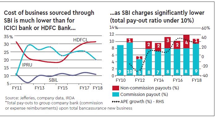 Best-in-class cost ratios: SBI Life operates at one of the lowest cost ratios within private players (4.4% commission rate & 6.8% opex/premium for FY18). Distribution expense (commissions + opex) for SBIN sourced business is only ~10% v/s more than 20% for ICICIBC & HDFCB . Is it sustainable? In the near to medium term, we believe it is: (i) SBIN gains through value creation from its ~62% stake in SBI Life; (ii) exclusivity of bancassurance partnership. That said, this structure is an anomaly that, when normalised, poses a risk to margins.