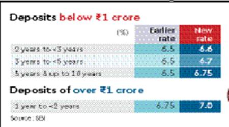 The rate on deposits of under Rs 1 crore maturing between two years and three years was raised by 10 bps to 6.6% and that on deposits maturing between three years and five years was hiked by 20 bps to 6.7%. Retail deposits of longer maturities will now yield 6.75%, 25 bps more than earlier. The rate on one-year retail deposits was left unchanged at 6.4%.