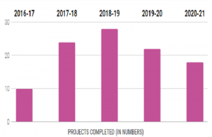 Ease of Doing Business for MSMEs: The annual number of cluster projects, which includes common facilities centres (CFCs) and infrastructure development (ID) facilities developed, has remained low vis-à-vis the number of projects approved in FY21 for the third straight year under the Micro and Small Enterprise – Cluster Development Programme (MSE-CDP). According to the available data from the MSME Ministry, 68 projects including 26 CFCs and 42 ID facilities were approved under the MSE-CDP out of which 6 CFCs and 12 ID facilities were completed during FY21. Likewise, 22 projects were completed out of 74 approved in FY20 and 28 projects were completed out of 36 approved in FY19. In contrast, 24 projects were completed in FY18 while 21 projects were approved.
