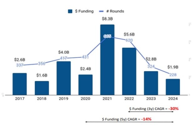 Early-stage deal value also dropped by 16 per cent to $562 million in 2024 from $667 million recorded in 2023 and a 70 per cent decrease from the $1.9 billion raised in 2022.