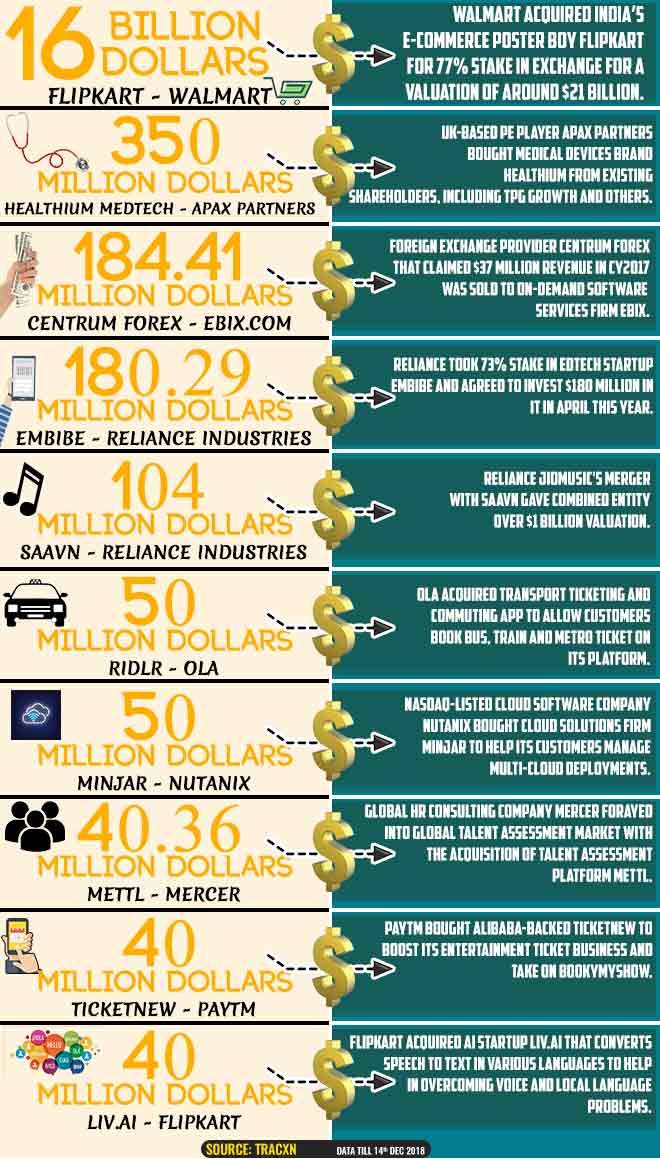 In the top 10 M&As of 2018 in India, Healthium MedTech-Apax Partners buyout was the only deal that crossed $300-million mark. Three acquisitions involving foreign exchange provider Centrum Forex, edtech startup Embibe and music app Saavn moved beyond $100 million value.