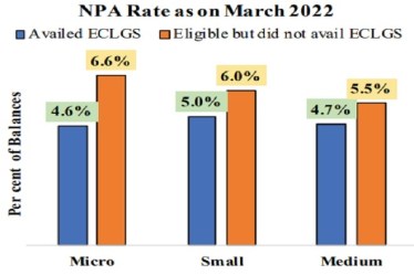 In the micro segment, units that availed ECLGS had an NPA rate of 4.6 per cent vis-a-vis 6.6 per cent among those units that didn’t avail it. Similarly, among small businesses, the NPA rate for enterprises that availed the scheme was 5 per cent against 6 per cent who didn’t avail it. Among medium enterprises, the NPA rate was 4.7 per cent for enterprises availing the scheme versus 5.5 per cent who were eligible but didn’t opt for it.