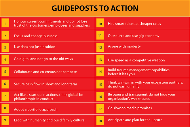 Given these traps and three scenarios that we believe could emerge, what should SMEs do? Give up? Wait and watch? Scurry around and hope? Based on our deep understanding of the small businesses and the situations they find themselves in, we recommend the following sector, size and geography agnostic 18-guideposts of action.