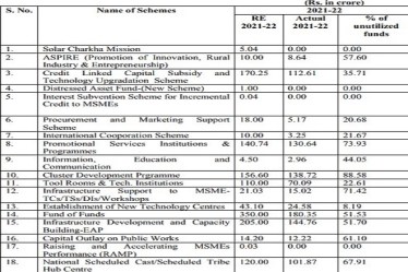 Among the schemes with the highest underutilisation rate in FY22 were Cluster Development Programme, Promotional Services Institutions & Programmes, Infrastructure Support to MSME Testing Centres/ MSME Testing Stations/ MSME Development Institutes/ MSME Workshops, National Scheduled Cast/Scheduled Tribe Hub Centre, Capital Outlay on Public Works, etc.