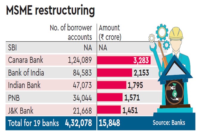At least 19 banks have restructured loans to MSMEs worth Rs 15,847.67 crore in 4.32 lakh accounts, the latest quarterly numbers show. So far Canara Bank has seen the highest share of 1.24 lakh accounts with an outstanding of Rs 3,282.83 crore. With a Rs 2,152.78-crore exposure to 84,583 restructured accounts, Bank of India came in second. Data for restructured MSME accounts was not immediately available for State Bank of India (SBI).
