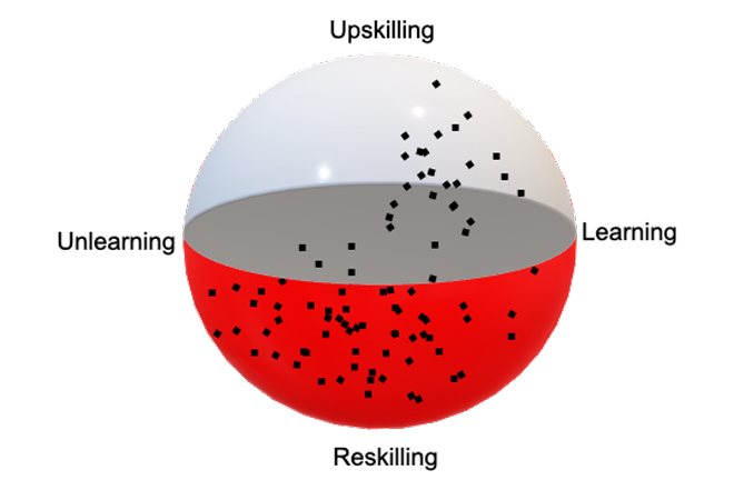 The exhibit above indicates the Learning-Skilling Geoid © where we depict the bottom red half of the geoid as the depressed MSME sectors, while the top whitish half as the coping MSME sectors. Our study suggests that the depressed MSMEs need to focus on unlearning and reskilling more than the upskilling and learning while the coping MSMEs need to focus on upskilling and learning. In many cases, these are transitionary strategies and not optional in nature. The Geoid is an emerging pattern, and the line of action may need to be contextualized to the case of each MSME.