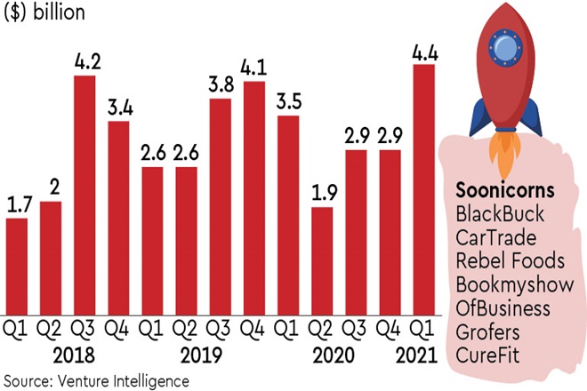 Investors infused a whopping $4.4 billion into Indian start-ups in the January-March quarter, according to data sourced from market research firm Venture Intelligence. This is a decent 26% increase over the same period last year. Firms had last raised $4.1 billion in funding in Q4 2019 calendar year and $4.2 billion in Q3 2018, the data showed. The momentum continued well into April with as many as six companies joining the ranks of the unicorn in a week after collectively bagging fresh funding worth about $1.5 billion. Barely four months into the current calendar year and the sector has already birthed 10 unicorns, with the pandemic-led digital push continuing to support tech businesses and a clutch of ‘soonicorns’ in the queue. Industry experts estimate more start-ups to attain a valuation of $1 billion and beyond. The segment added a total of about 11 unicorns in 2020, nine in 2019 and eight in 2018.