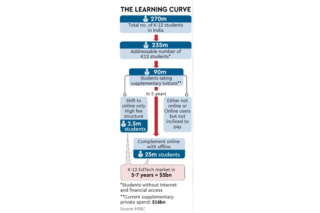 Experts point out ed-tech is growing on the back of changes in the approach to education and the rapid rise in the use of smartphones. Of the three broad categories – K-12 supplementary teaching for grades 1-12, test-preparation and higher education – analysts at HSBC reckon K12 offers the most potential. “K-12 is unsurprisingly the biggest opportunity and we think the market can grow up to $5 billion in five-seven years. Test-prep, which is higher education & government examinations, could be a $1.5-billion opportunity over a similar time frame,” Yogesh Aggarwal and AbhishekPathak wrote in a recent report.
