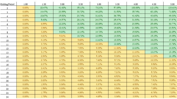 The chart shows the ROI (return on investment) against the Holding period of the asset. The cells reflect the Rate of Return (CAGR) of the assets being sold. The colours indicate the scheme which is more beneficial for the tax payer. Yellow indicates that the older indexation regime is more beneficial while green indicates that the new, lower tax rate regime is more beneficial.