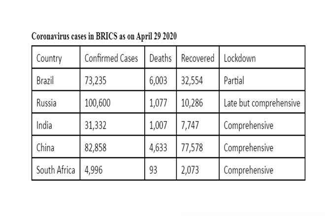 The number of confirmed cases has risen sharply in Russia. With more than 100,000 cases, it ranks the eighth in the world. Nevertheless, the cases of death have been very low (1007 or about one per cent), mainly due to better health infrastructure compared to other BRICS nations. Russia managed to slow the spread of the virus, but the peak is yet to come. The number of cases surpassed that of China. Russia was slow in initiating the lockdown towards the end of March as the number of cases was not clear in the initial stage. It has extended the lockdown until May 12. Russia sent medical supplies to the US and other countries as a goodwill gesture. But with the rising cases of hospitalisation, it is running short of protective gears for its healthcare personnel.